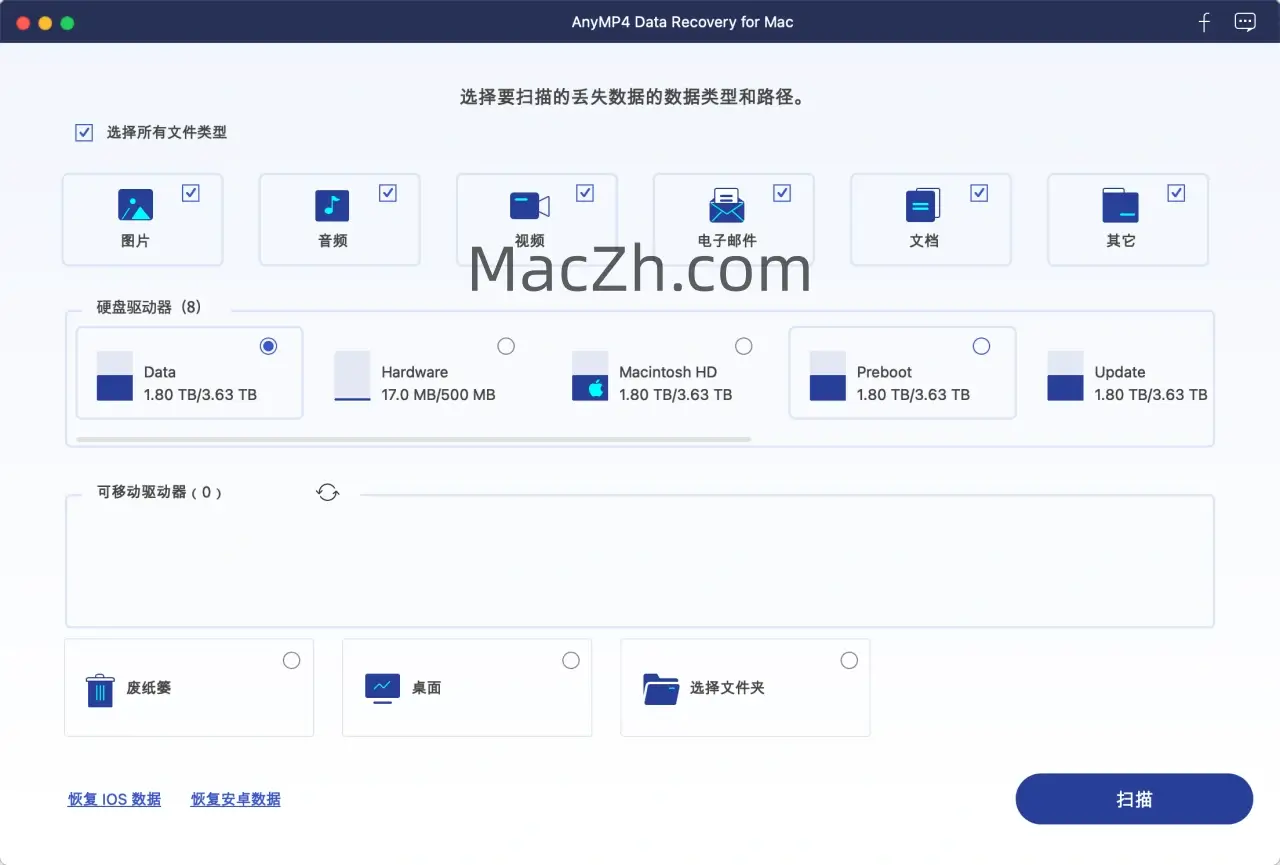 AnyMP4 数据恢复是一款专业且安全的数据恢复软件。它能帮助你轻松恢复几乎所有丢失的文件,比如照片、文档、邮件、音频、视频等,这些内容来自电脑硬盘、闪存盘、手机或相机的内存卡/随身棒。无论你是丢失文件以删除、格式化等,还是因系统崩溃、病毒攻击等原因丢失数据,你都可以使用这个强大的数据检索程序来帮助你。