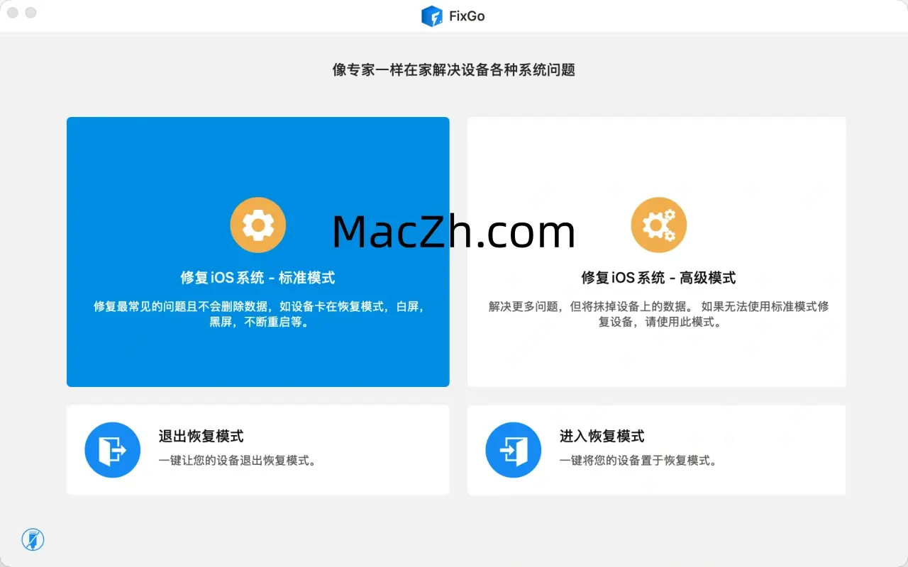 FixGo Mac是专为Mac系统设计的iOS设备修复工具,支持一键检测并修复iOS卡顿、黑屏、白屏等问题,提供标准模式(无数据丢失)和高级模式(可能丢失数据)两种修复方式。