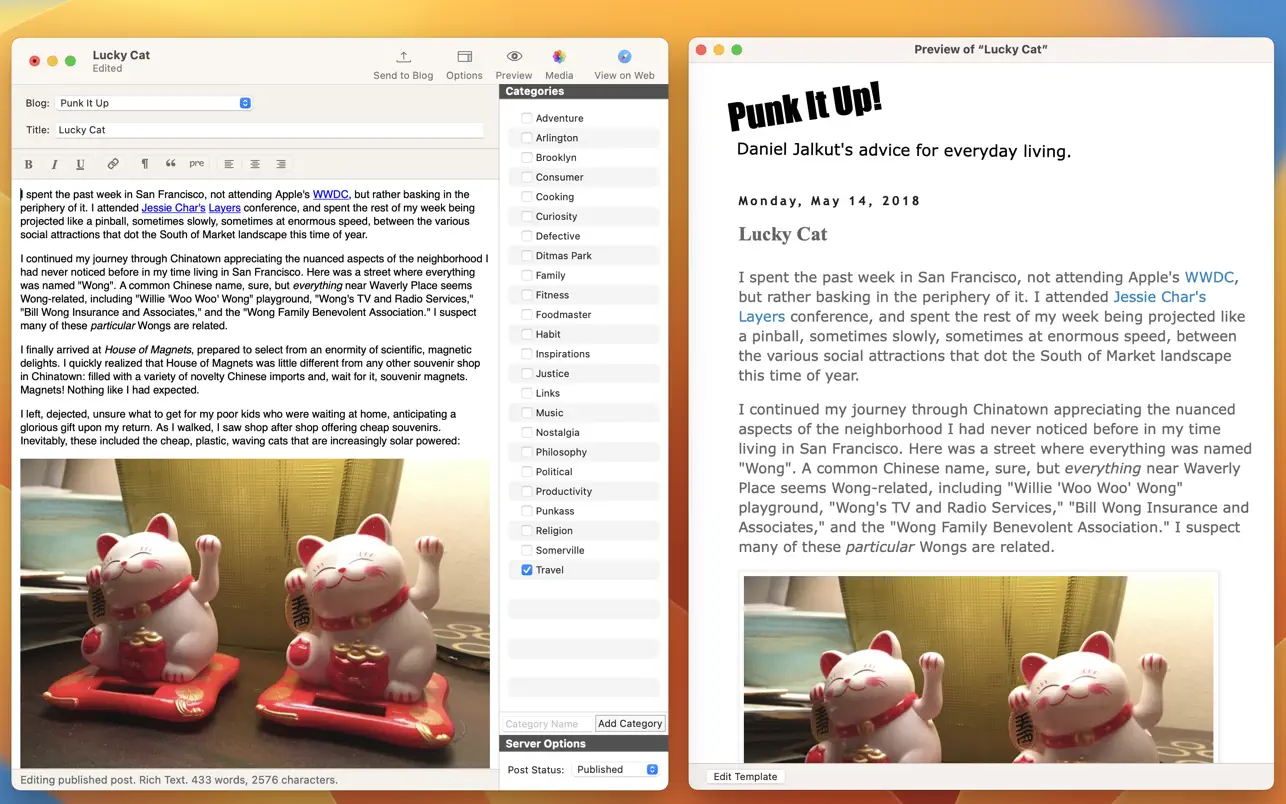基于浏览器的界面缓慢、笨拙,并且需要您在线才能使用它们。Web 浏览器非常适合阅读文章,但不适合创建文章。如果您正在为网络写作,您需要一个桌面博客编辑器。如果您有幸拥有 Mac,没有什么比 MarsEdit 更强大、更优雅的了。