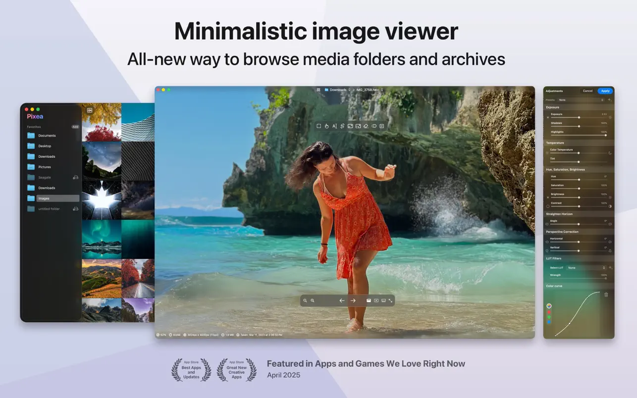 Pixea 是一款适用于 macOS 的图像查看器和视频播放器,拥有简洁简洁的用户界面。Pixea 在 HEIC、JPEG XL、PSD、RAW、WEBP、MKV、MP4 以及许多其他格式上表现良好。享受全新的浏览媒体文件夹和档案的方式。搜索、筛选、排序或随机你的媒体。去除缺陷和不需要的物品,或用 AI 驱动的工具放大低分辨率图像。通过调整色相、饱和度和色调来微调你的照片。添加水印。使用内置的批处理编辑器对一组图片进行图像调整。定义快捷键和触控板手势。